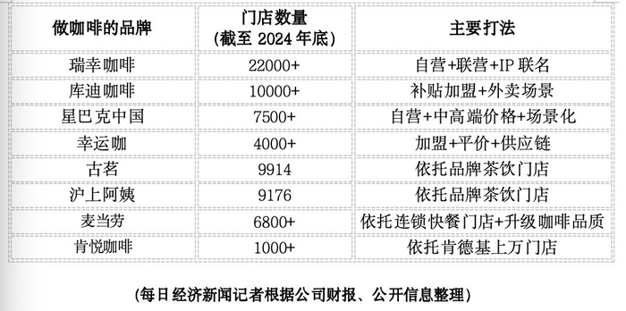 一个现实的情况是,幸运咖在2025年喊出万店目标时,咖啡市场已进入混战时刻:瑞幸咖啡、库迪咖啡在高线市场攻城略地,库迪咖啡甚至宣称要在2025年底时将门店开到5万家;门店数都在9000家以上的“古茗”“沪上阿姨”也跨界布局咖啡产品;在中国市场拥有上万家门店的肯德基,推出独立咖啡品牌“肯悦咖啡”;2025年初,有着约7000家门店的麦当劳升级“麦咖啡”。而且,这些品牌的咖啡都主打十元以下价位。