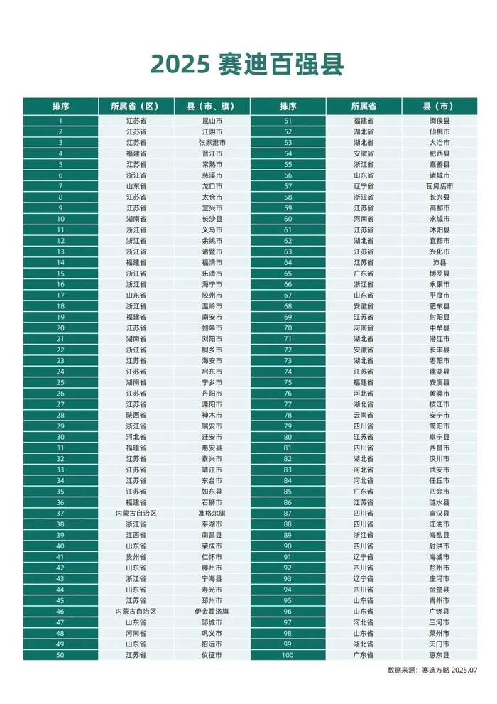 同时,《研究》中公布了“2025赛迪百强县”。从百强县的分布上看,江苏省、浙江省、山东省三省表现突出,分别占25席、15席和12席。百强县前10名中江苏省独占6席,并包揽前3位。