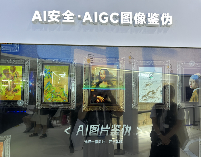 展区现场,公司举办了一场“世界名画版大家来找茬”活动。现场工作人员告诉界面新闻,实际应用场景中被检测的图像往往要经历压缩、缩放、裁剪及社交媒体传输等多个环节,图像质量降低,增加了检测难度。现场展出的AIGC图像鉴别技术则具备了抗攻击能力强的独特优势,能够在压缩、裁剪、社交媒体传输等干扰下精准捕捉图像异常特征。