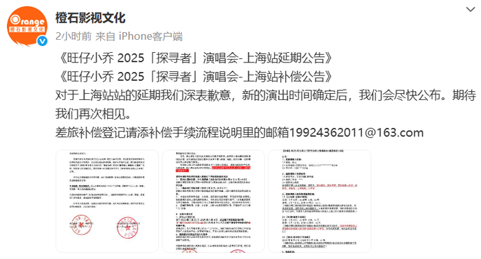 同晚,橙石影视文化官方微博发布旺仔小乔2025「探寻者」演唱会-上海站补偿公告,表示对上海站的延期深表歉意,新的演出时间确定后会尽快公布。