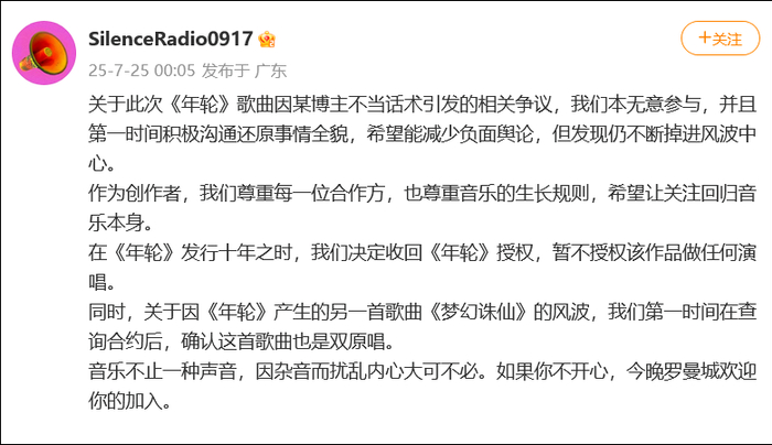对此,7月25日,汪苏泷方回应决定收回《年轮》授权。