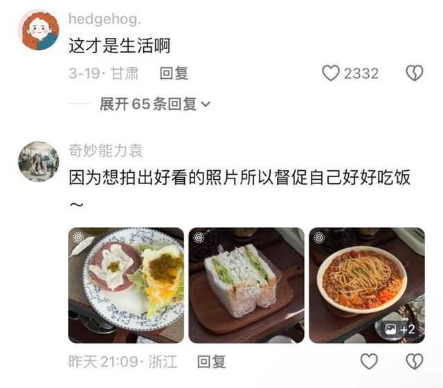 网友“猫和少女好天气”称,吃漂亮饭也能获得能量,卡在工作和生活的齿轮之间,总需要一场舌尖出逃计划,让“漂亮饭”弥补生活的褶皱。