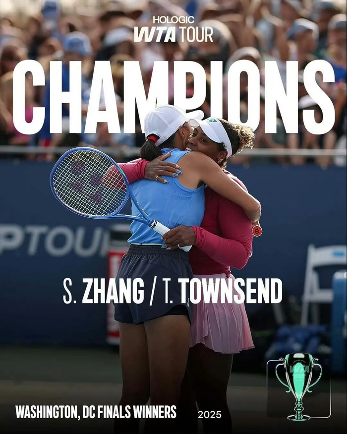WTA500华盛顿站双打决赛,2号种子张帅/汤森德以6-1 6-1横扫多勒海德/肯宁,首次搭档便成功捧杯。张帅今年四进决赛终于夺冠,这也是她职业生涯的第15个巡回赛双打冠军。汤森德斩获WTA双打第10冠,也将首登女双No.1。