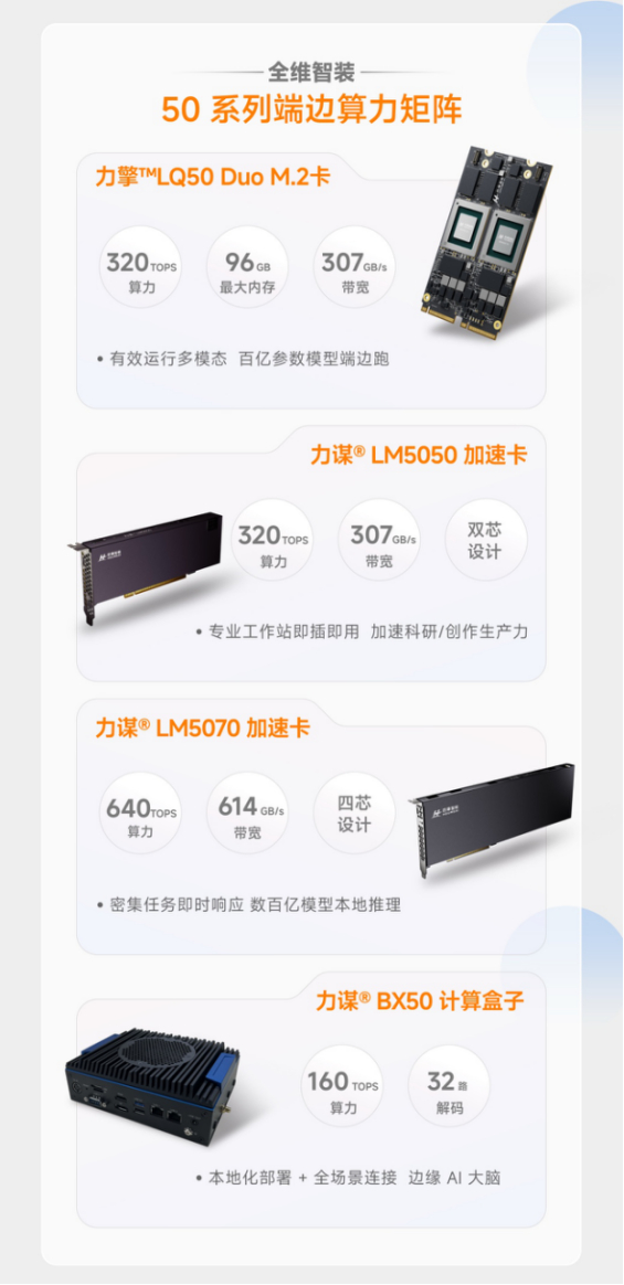 力擎LQ50 Duo M.2卡,则集成双M50芯片,具备320TOPS 算力,可实现14B/32B大模型端侧部署;力谋LM5050 加速卡与力谋LM5070 加速卡分别集成2颗、4颗M50芯片,为单机及超大模型推理提供高密度算力,最算力高达640TOPS;此外,BX50计算盒子则以紧凑机身适配边缘场景,支持32路视频分析与本地大模型运行。