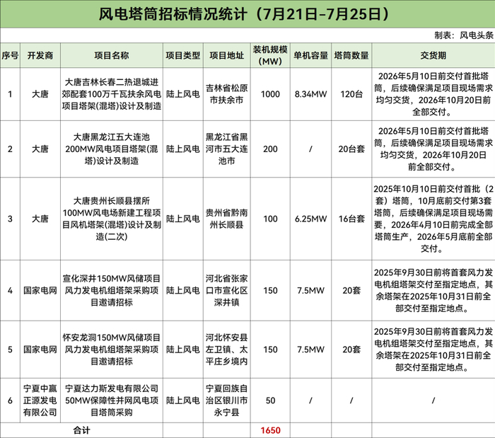 据风电头条统计,7月21日-7月25日风电整机采购开标总计1706.7MW,风电机组招标总计11322.25MW;风电塔筒开标总计100MW,风电塔筒招标总计1650MW。