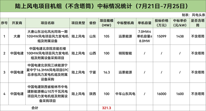 大唐开标305MW,金风科技中标200MW,远景能源中标105MW。