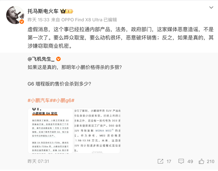 虚假消息!小鹏高管回应G6降本方案传闻