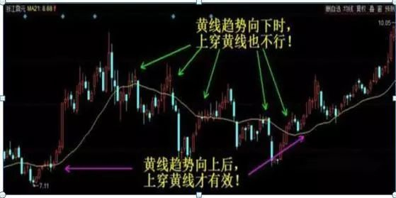 如上图,如果只看K线就知道这是个正常的波动市,有人肯定会说:“我就喜欢这个,最适合做高抛低吸啦!”您先别急,您回忆一下您每次高抛低吸都刚好抛在山峰上、抄在山谷里?其实是经常追在山腰上、又等跌回来才割吧?嘿嘿,问题就是,咱看到后面的走势了才知道前面是那样儿的,对吧!您本来以为一反弹就拉起第二波能创新高的是不是?……那么,21天均线就告诉您,到底是冲高回落还是拉出主升浪!……再次看上图,只有当黄线上翘的时候,K线上穿黄线才是主升浪,如果黄线还在下移,就别那么自信的做波段,咱不知道它站上均线后到底能涨几天就下杀。