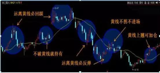 无论21天均线是上行或是下行过程中,K线远离它一段时间后必定回踩,这个时间段一般为5天或8天,不会超过13天!(这几个数字请牢记,有助于帮您抓住底和顶)21天均线下行趋势中回踩就逃离,上行趋势中回踩就加仓!(注意加仓和建仓的区别,21天均线的拐点才是建仓的位置)而回踩之后,只要21天均线没有改变运行方向,那么,K线也不会扭转总体趋势。