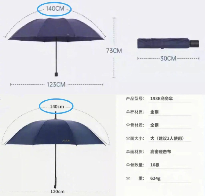 直柄伞就宽敞多了。直柄伞的伞骨可达10骨以上,根据《伞类产品 规格尺寸》规定,10骨以上的伞面长度可达到75cm。而且从市面来看,10骨以上直柄伞的伞面长度一般为70cm左右,基本超过折叠伞。这样,男女主一同躲在直柄伞下,舒适度能提升不少。