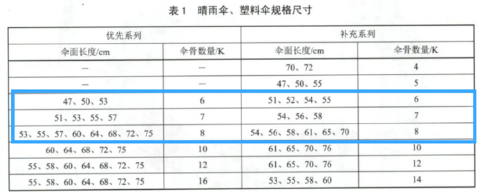 折叠伞一般为6—8骨,根据《伞类产品 规格尺寸》标准,6—7骨伞的伞面长度最大为58cm,8骨伞虽允许达到75cm,但市面上常见折叠伞的伞面长度一般为50—60cm。