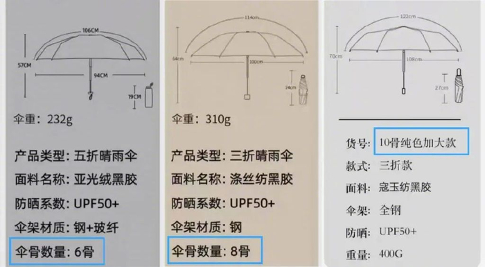 淘宝天堂伞官方旗舰店热销第1名商品“天堂伞防晒防紫外线太阳伞遮阳伞轻小巧便携折叠晴雨伞女两用男士”的规格尺寸,其中五折款为6骨,三折款为8骨,加大三折款为10骨|图源:淘宝@天堂伞官方旗舰店 截图