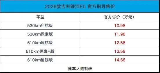 7月24日,2026款吉利银河E5正式上市,新车共推出5款车型,售价区间为10.98-14.58万元,与老款车型保持一致。新车针对外观、内饰以及动力系统均进行了不同程度的升级。