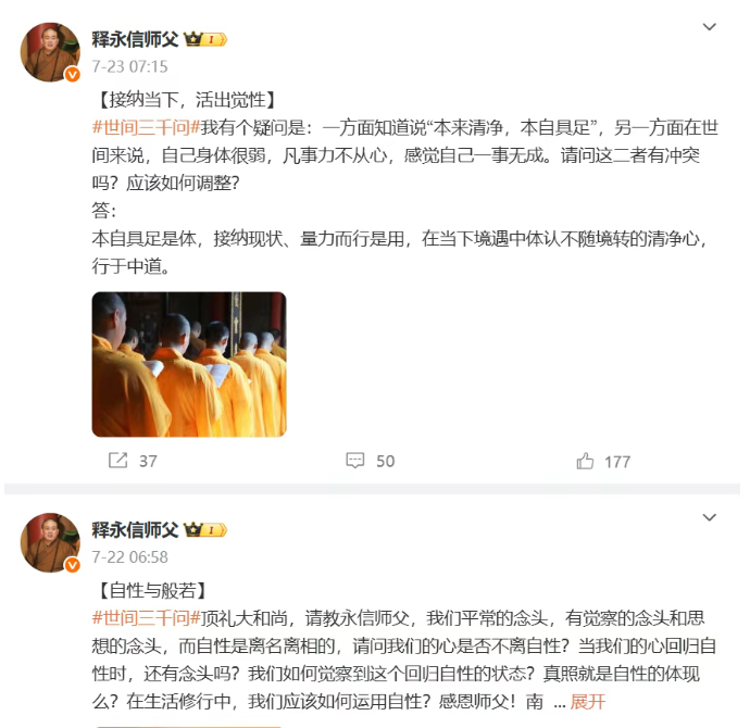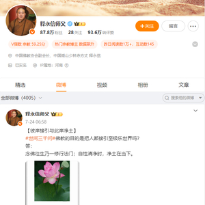 释永信的个人微博开通于2018年3月20日,截至7月27日,粉丝数达87.8万。按其发布最后一条微博的日期计算,释永信微博已开通2683天,共发布微博4005条,平均每天约1.5条,其中7月份每日至少发布一条动态,至24日早上后暂无发布。