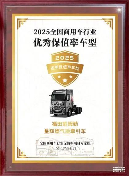 福田戴姆勒:星辉燃气版牵引车获“2025全国商用车行业优秀保值率车型”荣誉!