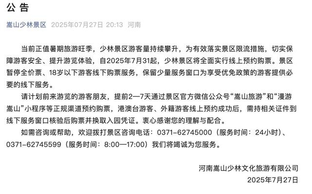 当前正值暑期旅游旺季,少林景区游客量持续攀升,为有效落实景区限流措施,切实保障游客安全、提升游览体验,自2025年7月31日起,少林景区将全面实行线上预约购票。景区暂停全价票、18岁以下游客线下购票服务,保留少量服务窗口为享受优免政策的游客提供必要的线下服务。