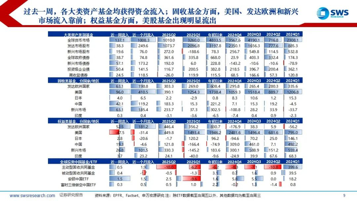 全球资金流向方面:截止到2025/7/24,过去一周来看,A股资金面上呈现出海外主动流出而被动流入,海外资金流入而内资流出的资金格局,其中:海外资金主动和被动方面,海外主动基金过去一周流出5.35亿美元,而海外被动基金过去一周流入26.01亿美元;内资和外资方面,内资过去一周流出1.41亿美元,而外资过去一周流入20.66亿美元。过去一周,各大类资产基金均获得资金流入;固收基金方面,美国、发达欧洲和新兴市场流入靠前;权益基金方面,美股基金出现明显流出。过去一周,美股资金流入金融、工业品和医疗保健行业,流出科技、材料和消费行业;中股资金流入科技、金融和材料行业,流出医疗保健、消费和通信行业。