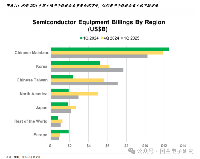 半导体设备板块:半导体设备景气度稳健向上,根据 SEMI 2025 年 6 月 6 日最新发布的报告来看,受益于人工智能热潮及自主可控大趋势,全球半导体设备市场 25 年一季度同比增长 21%,达到 320.5 亿美元,受季节规律影响,环比出现小幅下滑。分区域来看,中国仍是全球半导体设备最大的下游市场,25 年一季度中国大陆半导体设备出货量达 10.26亿美元,在 24 年高基数的情况下同比下滑 18%。