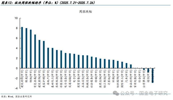 回顾本周行情,参考申万一级行业划分,涨跌幅前三名的行业分别为建筑材料、煤炭、钢铁,涨跌幅分别为8.20%、7.98%、7.67%。涨跌幅后三位为公用事业、通信、银行,涨跌幅分别为-0.27%、-0.77%、-2.87%。本周电子行业涨跌幅为2.85%.