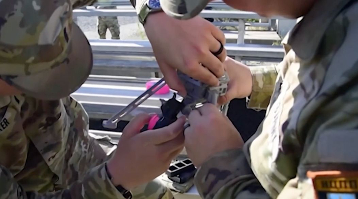 视频中,美陆军人员将标准M67手榴弹以及M69训练手榴弹装载到有专用投掷装置的小型四轴飞行器上,完成一次无人机投弹。并为这次无人机训练洋洋得意地配文——“你见过无人机投掷手榴弹吗?”