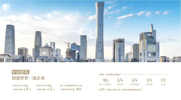 中国建筑以房屋建筑承包、国际工程承包、地产开发、基础设施建设和市政勘察设计为核心业务;也是中国唯一家拥有三个特级资质(房屋建筑工程施工总承包、公路工程施工总承包、市政公用工程施工总承包)的建筑企业;建筑领域唯一家由中央直接管理的国有重要骨干企业。在我国,中国建筑投资建设了90%以上300米以上摩天大楼、3/4重点机场、3/4卫星发射基地、1/3城市综合管廊、1/2核电站,每25个中国人中就有一人使用中国建筑建造的房子。