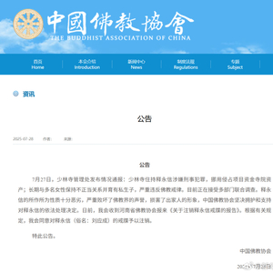 中国佛教协会发布公告:同意对释永信的戒牒予以注销