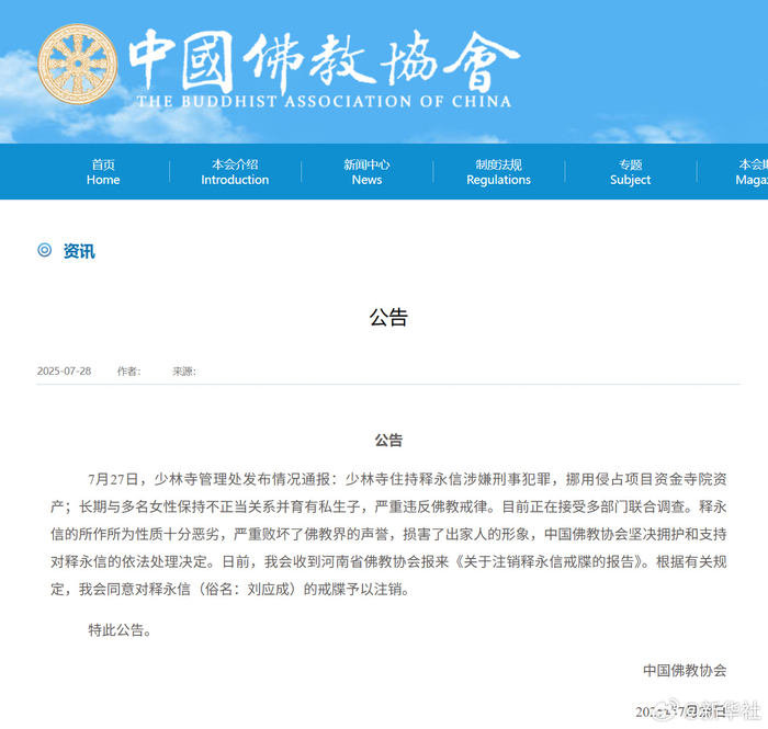 7月27日,少林寺管理处发布情况通报:少林寺住持释永信涉嫌刑事犯罪,挪用侵占项目资金寺院资产;长期与多名女性保持不正当关系并育有私生子,严重违反佛教戒律。目前正在接受多部门联合调查。释永信的所作所为性质十分恶劣,严重败坏了佛教界的声誉,损害了出家人的形象,中国佛教协会坚决拥护和支持对释永信的依法处理决定。日前,我会收到河南省佛教协会报来《关于注销释永信戒牒的报告》。根据有关规定,我会同意对释永信(俗名:刘应成)的戒牒予以注销。