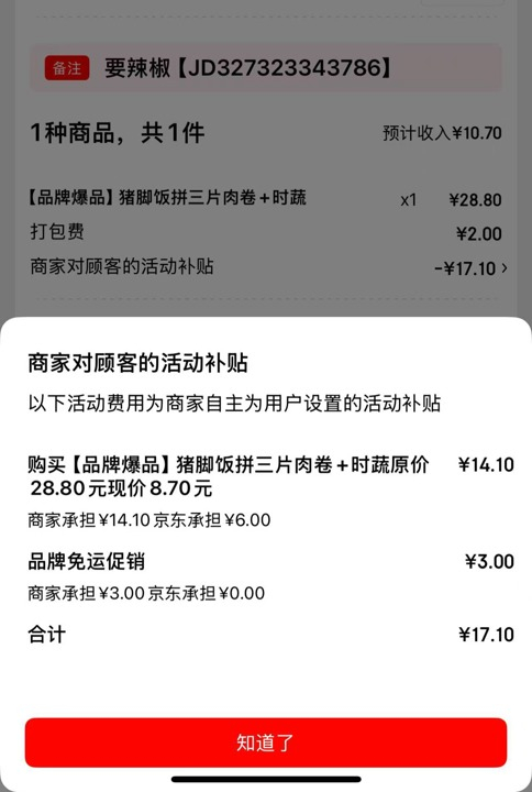 4月,京东推出百亿补贴计划。最初的十几天,补贴凶猛:她家的餐品,用户下单立减 15 元,平台全额承担,王丽每单收入能有十八九元。仅京东外卖一家平台日单就超200单,收入3000多元,和堂食利润几乎持平,受到鼓舞的王丽特意多雇了一个帮厨。但这场补贴狂欢,远比想象中短。半个月后,王丽发现,京东平台的消费券补贴开始缩水,刚开始是平台和商家七三分承担消费补贴,很快变成五五分,再到三七分,小店承担了大头。同样餐品,在其他平台能卖十二三元,在京东只卖到10.7元。