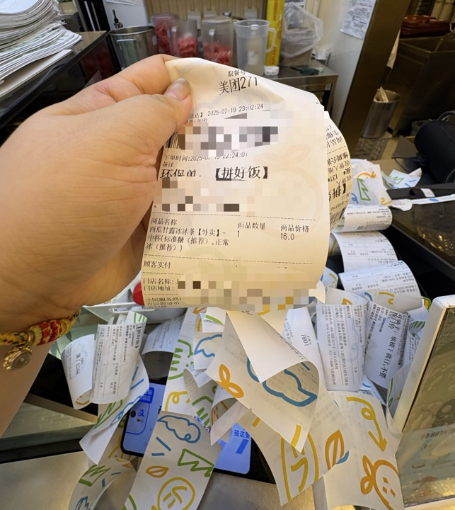 “平台要的是数据,连锁品牌有几百家店,一下子就能冲几十万单,而我的店,撑死了也只有两三百单。”王丽的落差感越来越强烈。陈景的蛋饼店也一样窘迫。7月的日营业额从原来的七八千元跌至一两千元,她将此归为小店参加各种大额满减活动的“副作用”。平台设计了“阶梯出资大额券”,针对不同价位的商家设置不同的满减门槛,从28元到88元不等,均要商家承担券额的大部分:第一档是12元,后面则是券面五分之四左右的价格。陈景参与了两个平台的“神券”活动。后台收入明细显示:一份定价17.8元的招牌双蛋饼附加3元打包费,商家需补贴客户8.65元(含膨胀神券、配送费、新客立减等),平台仅承担膨胀神券中的2元。最终,陈景实际到手仅7.5元。她核算过,线下卖出一个13元的蛋饼,收入的一半都是毛利润,但线上卖出一个,赚不到钱。王丽明显感觉到平台的大额补贴是在“挑选”商家。她向隔壁连锁奶茶店求证。店长告诉她,平台直接跟品牌方谈,一杯奶茶平台补8元,门店只负责执行,不用考虑自行追加商家红包。而平台负责这一区域餐饮小店的运营人员,从未和王丽沟通过平台补贴商家的事宜。“在这场价格战中,我们这些小店甚至都没拿到入场券。”王丽恍然大悟。平台大额补贴对连锁奶茶店的效果立竿见影,大量两三元乃至0元一杯的奶茶订单开始涌现。根据美团平台统计,7月的第二个周六,为了冲击单量,当天出现了至少1000万单不用骑手配送的自提单,实付为0元。7月17日晚10点多,上海市区内一家蜜雪冰城的操作台上,成堆的空杯摇摇欲坠。19岁的暑假工小林正埋头冲奶茶,她的额前碎发被汗水粘在皮肤上。小林甩了甩酸胀的手腕,拿起最新打印出的订单小票,上面写着"0元柠檬水"。“这已经是今晚第12单了。”值班店长轻声嘟囔,手上动作未停,“零元购、几毛购……昨晚干到凌晨两点多,今晚又不知道到几点了。”其中一个零元购订单备注栏,顾客有句俏皮的留言:“感谢白送的快乐!”