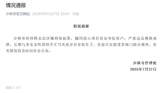 确定性消息终于来了。在27日晚8点,少林寺管理处发布通报,确认释永信因涉嫌刑事犯罪,挪用侵占寺院资产,及严重违反戒律,与多名女性有不正当关系并育有私生子,正接受多部门联合调查。
