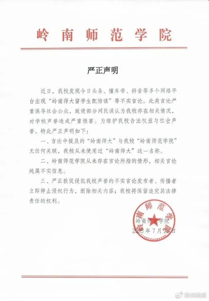 7月28日,岭南师范学院就“岭南师大留学生配陪读”言论发布严正声明:相关言论纯属不实信息。