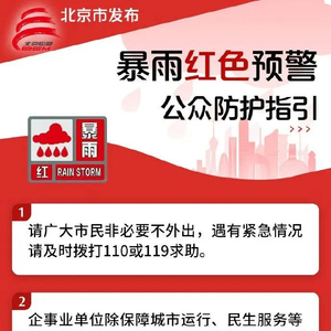 北京市应急办发布暴雨红色预警公众防护指引:请广大市民非必要不外出,企事业单位除保障城市运行、民生服务等外,非必要不要求员工到岗上班。