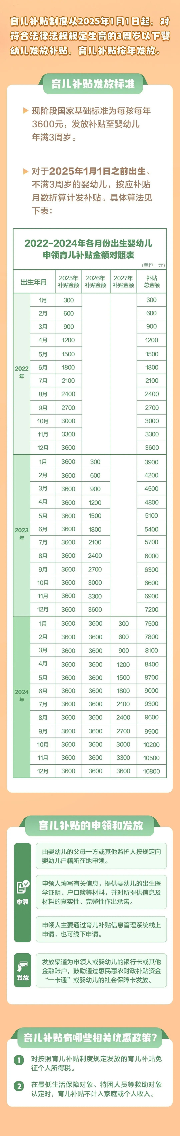 其中,对2025年1月1日之前出生、不满3周岁的婴幼儿,按应补贴月数折算计发补贴。对按照育儿补贴制度规定发放的育儿补贴免征个人所得税。在最低生活保障对象、特困人员等救助对象认定时,育儿补贴不计入家庭或个人收入。