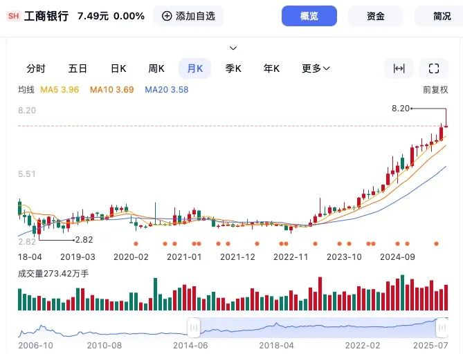 看看宇宙行工商银行A股的走势,两年多从两三块钱到八块多,如同大象在针尖上跳舞。