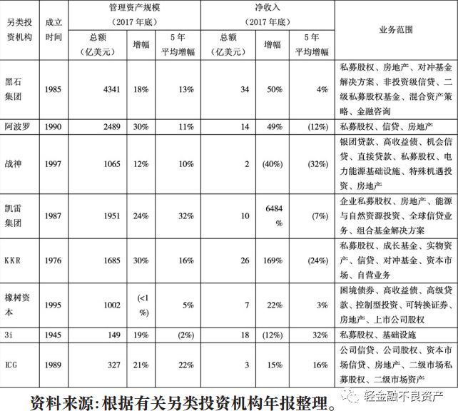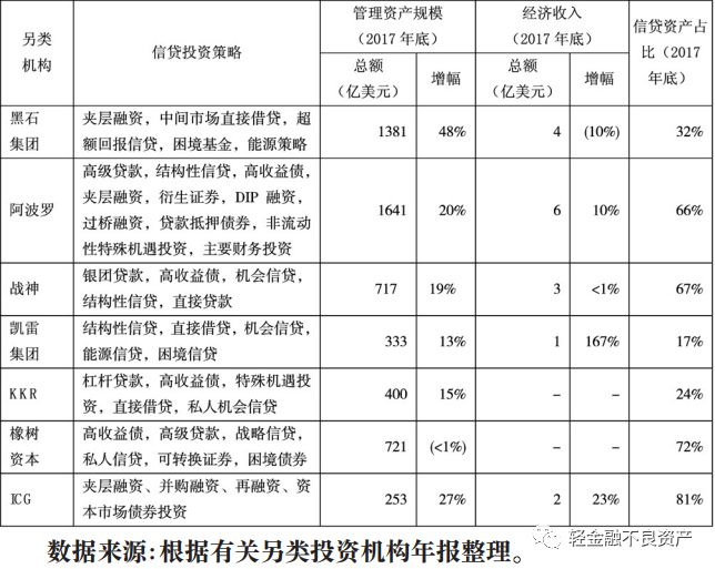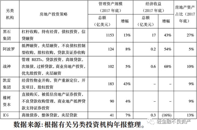 国际另类投资机构以不良资产业务为主的并不多,但在其发展和壮大过程中,无论是主动进入不良资产领域追求高收益,还是由于经济金融危机被动投资不良资产,国际另类投资机构的成长或多或少都得益于不良资产业务的开展,而不仅限于不良资产投资。