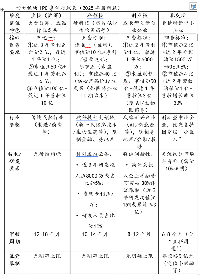 截至2025年7月的主板、科创板、创业板、北交所四大板块IPO核心条件对照表,整合最新政策动态(如科创板第五套标准重启、创业板第三套标准启用、主板门槛提升等),便于企业快速定位适配板块: