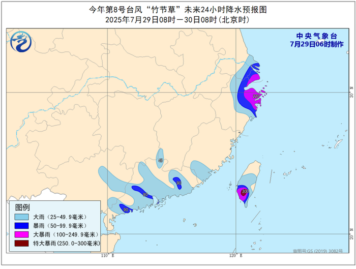 降水预报:7月29日08时至30日08时,江苏中南部、上海、浙江东部、福建东南部、广东、广西东部、台湾岛等地部分地区有大到暴雨,其中,上海、浙江中北部、台湾岛南部等地部分地区有大暴雨,局地特大暴雨(250-300毫米)。上述部分地区伴有短时强降水(最大小时降雨量20-60毫米)。