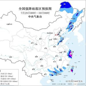 预计7月29日08时至30日08时,东北地区中西部、华北中东部、江淮东南部、江南东北部等地的部分地区将有8级以上雷暴大风或冰雹天气;内蒙古东北部、东北地区中部、华北东部、黄淮北部、江淮东南部、江南东北部、西南地区东部、华南等地的部分地区将有小时雨量大于20毫米的短时强降水天气,其中,内蒙古东北部、黑龙江西北部、吉林中东部、辽宁中西部、河北东部、江苏南部、上海、浙江北部等地的部分地区小时雨量大于50毫米,最大可达80毫米以上。