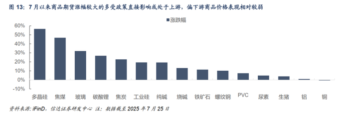 理论上,产能过剩可以通过市场化优胜劣汰的方式出清,但地方政府出于维持经济增速、提升地方税收等因素考虑,往往会推动提供大量政府补贴、信贷资源吸引企业投资,使得产能过剩的状态维持。2025年7月1日召开的中央财经委第六次会议或可被视为本次“反内卷”的顶层方案,但相关内容主要也是对于地方政府的行为进行约束,希望发挥市场化优胜劣汰的机制推动产能过剩的解决,因此“反内卷”本质上应当是被视为一种结构性的改革,将在长期发挥更大作用。但近期各部门与行业在执行过程中,似乎更加重视“反内卷”的短期效果,希望通过限产或是达成价格联盟的形式来推动通胀的走高。相关措施似乎层层加码不断推进,预期变化使下游贸易商囤货动力增强,在短期确实推动了商品价格的上行。但在终端需求未有明显改善的情况下,上游价格的大幅上行本质上是行业利润的再分配,中下游企业可能面临更大的压力,生产活动的收缩可能对短期经济数据造成冲击,最终可能也不利于通胀的持续回升。