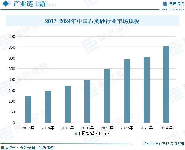 石英砂是通过碾碎石英石加工制成的细小颗粒,作为超白玻璃的主要原材料,具有耐高温、高度绝缘、耐腐蚀、热膨胀系数小等特点。根据应用领域不同,石英砂可分为光伏超白玻璃用低铁石英砂、光伏用高纯石英砂、板材砂、铸造用砂、覆膜砂等,其中低铁石英砂以其极低的杂质含量和高纯度特性,成为光伏超白玻璃生产的核心原料。近年来,在需求增长以及产品价格上扬的双重提振下,我国石英砂市场规模持续扩张。数据显示,2024年中国石英砂市场规模约为353.7亿元。未来,随着光伏技术升级,对石英砂的铁含量和纯度要求持续提升,推动行业向高端化发展。