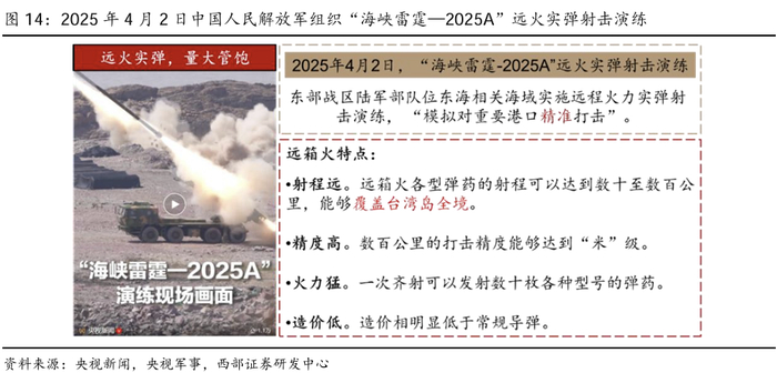 我国远箱火能够做到“量大管饱”,针对目标进行精准打击。2025年4月2日,中国人民解放军东部战区位台湾海峡中部、南部相关海域组织“海峡雷霆—2025A”远火实弹射击演练,对重要港口、能源设施等模拟目标进行精确打击,取得了预期效果。