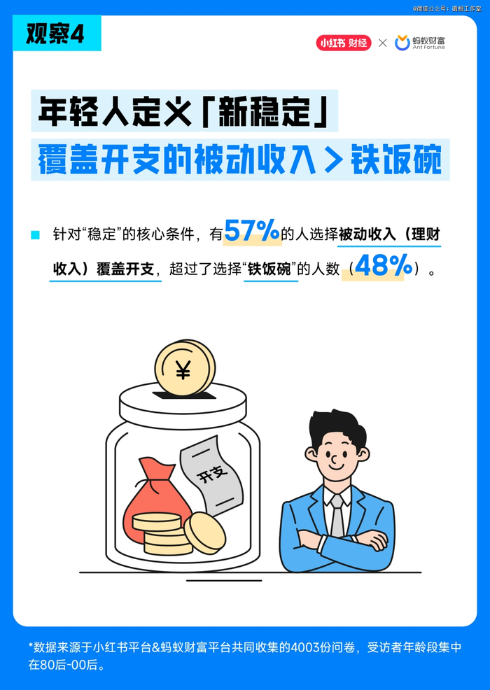 越来越多的年轻人开始通过理财,来寻找人生的稳定和安全感。《避险青年调研报告》显示,有57%的年轻人将被动收入,即理财覆盖开支,认为是“稳定”的核心条件,比例甚至超过了选择在体制内的人数。