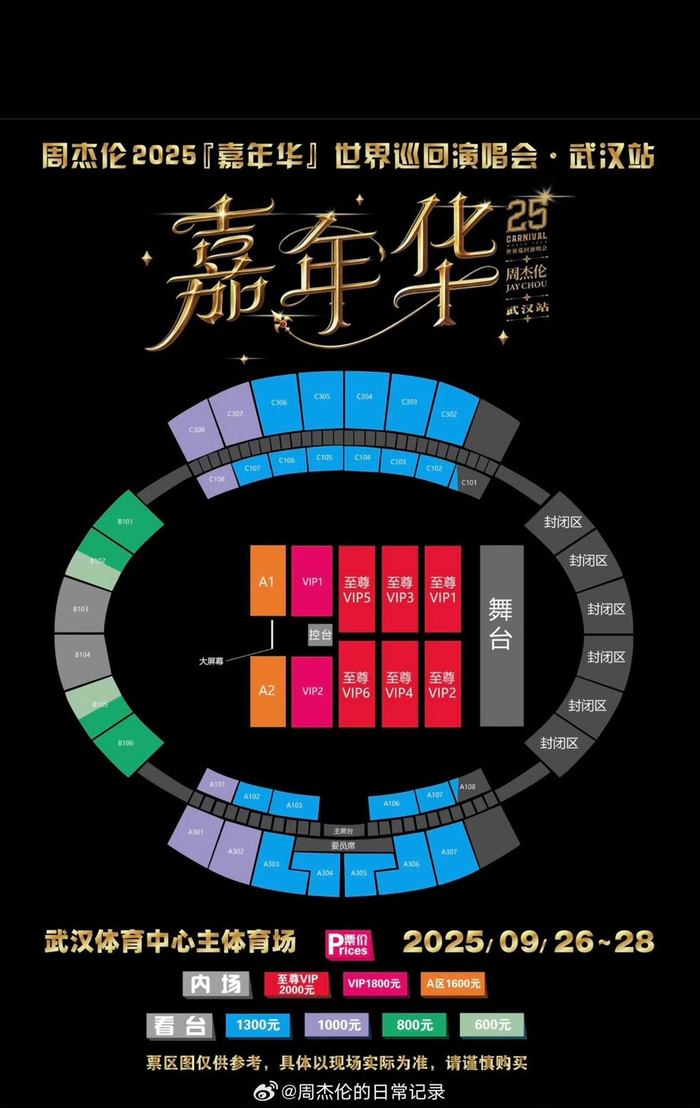 而就在29日上午,极目新闻记者关注到,许多网友在社交平台反映周杰伦2025“嘉年华”演唱会武汉站“吃相难看”,原因是,售价2000元的“至尊VIP”内场票档被划分出了6块区域,靠近中控台、在体育场内很可能肉眼看不清周杰伦样子的VIP坐席,卖到了1800元,内场中靠近大屏幕的A区票买到了1600元。