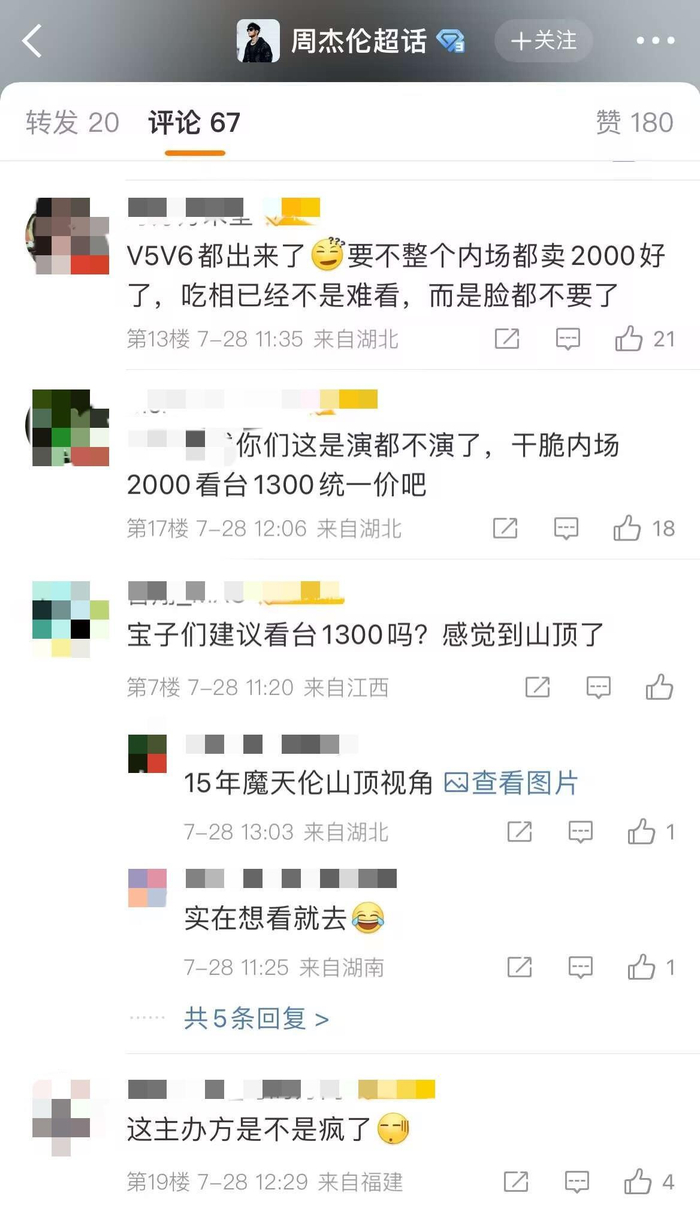 周杰伦武汉演唱会被指“离谱”:2000元至尊VIP占内场6块区域,1600元可能看不清周杰伦的脸
