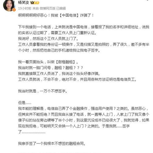 杨笑汝称,致电上门工作人员要求撤销合同,对方承诺次日处理。大V随即拨打中国电信官方客服投诉,强调遭遇“诈骗”,但客服仅表示“已记录”,并建议先等待工作人员处理结果。目前该大V仍在等待其所签贷款合同的撤销结果。