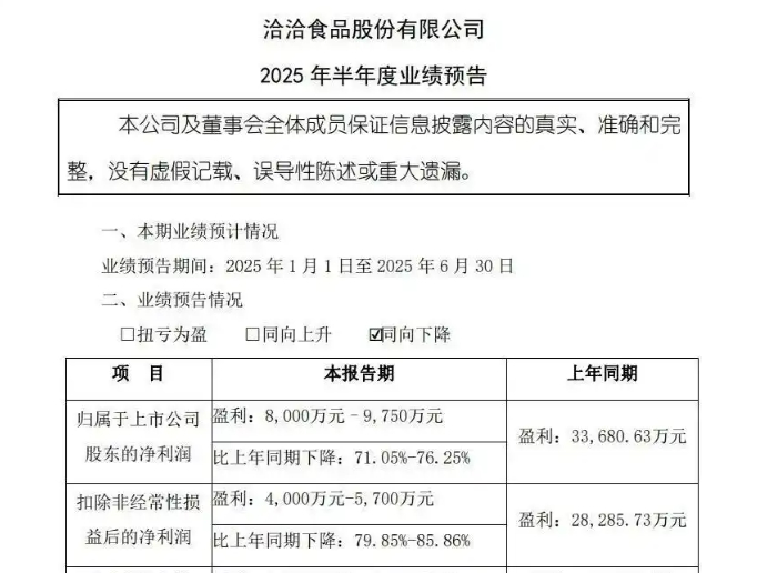 近日,洽洽食品股份有限公司发布2025年上半年业绩预告,归母净利润预计在8000万至9750万元之间,同比跌幅高达71.05%至76.25%。