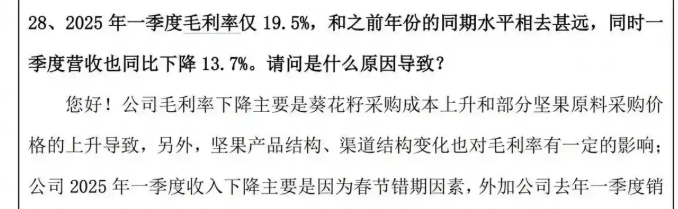 今年一季度,洽洽食品收入同比下滑 13.76%,净利润暴跌67.88%。在2025年4月的投资者活动上,公司解释一季度收入下降,一方面是春节错期的影响,另一方面则是去年一季度销售收入基数较高。