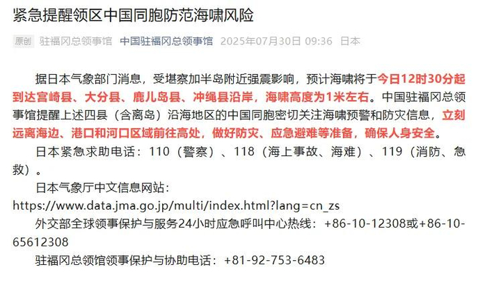 中国驻福冈总领事馆紧急提醒领区中国同胞防范海啸风险: