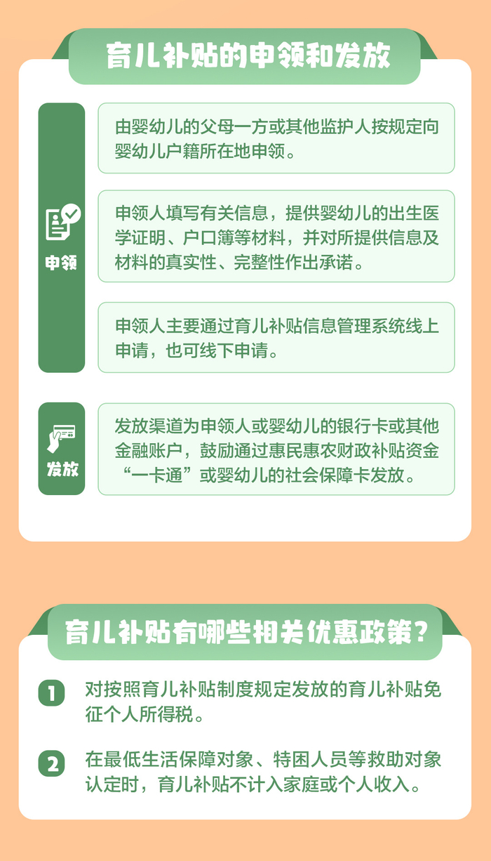 育儿补贴发放渠道为申领人或婴幼儿的银行卡或其他金融账户。对按照育儿补贴制度规定发放的育儿补贴免征个人所得税;在最低生活保障对象、特困人员等救助对象认定时,育儿补贴不计入家庭或个人收入。