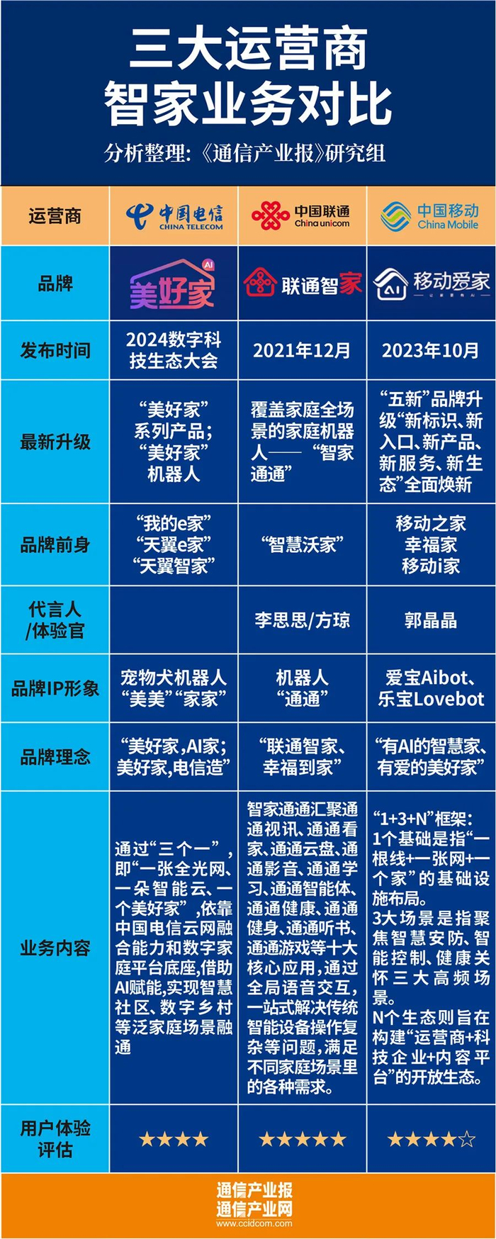 在智家业务上,三大运营商品牌名称各有不同,中国电信为“美好家”,中国联通为“联通智家”,中国移动为“移动爱家”。